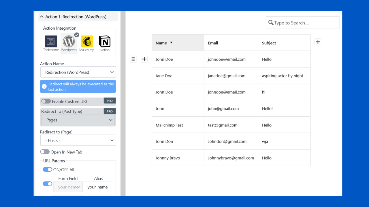So in the latest version of Tablesome (v 0.8.6), you have the Redirection Action for WordPress forms. This action works for all supported form plugins namely Contact Form 7, WPForms, Forminator, and Elementor Forms.